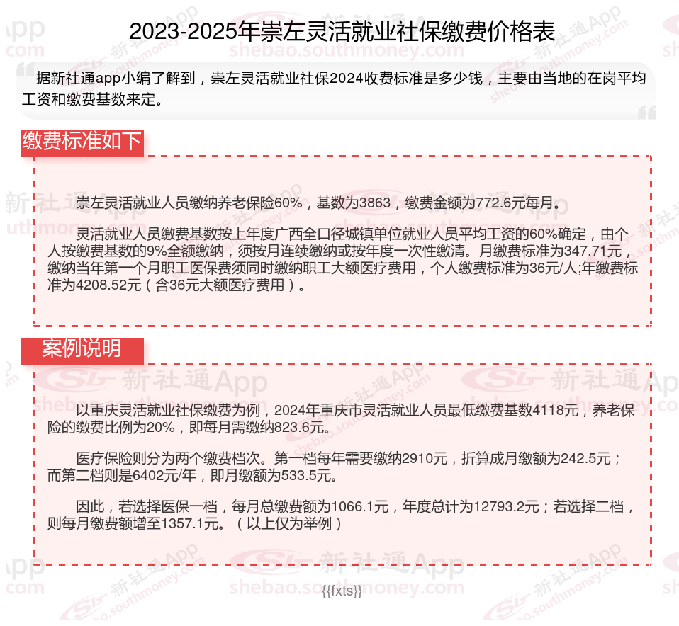 据新社通app数据显示,崇左灵活就业人员养老缴费基数2024-2025年最新标准如下: