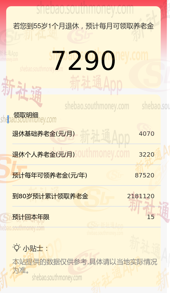 康某,广州人,1970年出生,是一名拥有25载社保缴费年限的退休女性,缴费档次稳定在250%。岁月流转,她终于迎来了自己的退休时光。借助新社通app养老金在线计算器计算所得: