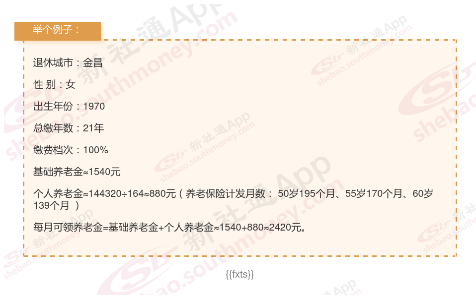 退休城市:金昌,性别:女,出生年份:1970,总缴年数21年,缴费档次:100%