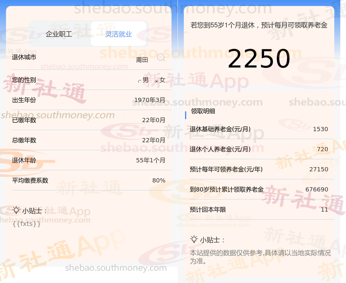退休城市:莆田,性别:女,出生年份:1970,总缴年数22年,缴费档次:80%,新社通app养老金计算器所得: