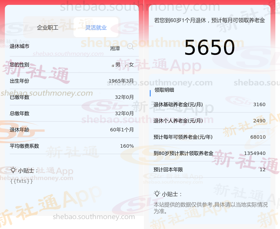 退休城市:湘潭,性别:男,出生年份:1965,总缴年数32年,缴费档次:160%,新社通app养老金计算器所得: