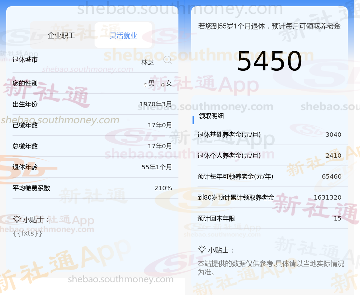 退休城市:西藏林芝,性别:女,出生年份:1970,总缴年数17年,缴费档次:210%,新社通app养老金计算器所得: