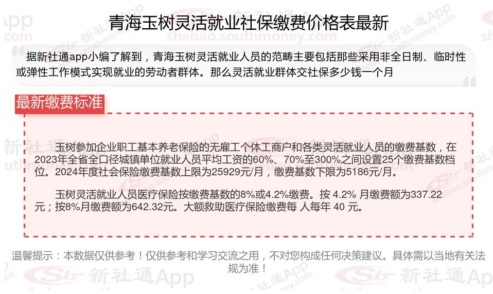 据新社通app数据显示,青海玉树灵活就业养老保险缴费基数2024-2025年最新标准如下: