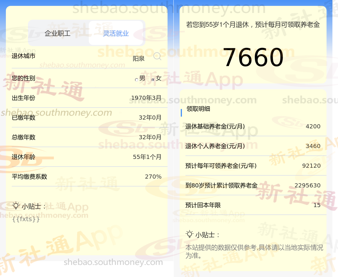 基础养老金:以当地上年度在岗职工月平均工资和本人指数化月平均缴费工资的平均值为基数,缴费每满1年发给1%。计算公式为:基础养老金=(参保人员退休时全区上年度城镇单位在岗职工月平均工资+本人指数化月平均缴费工资)/2×缴费年限×1%。