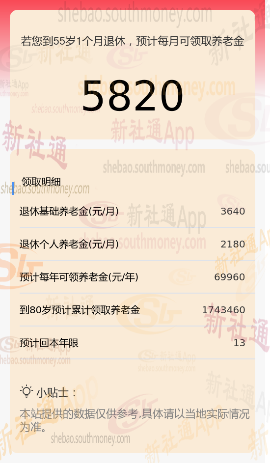 每月可领养老金=基础养老金+个人养老金≈3640+2180≈5820元。