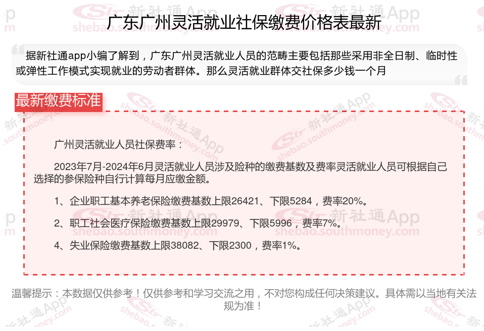 据新社通app数据显示,广东广州灵活就业人员养老保险缴费基数2024-2025年最新标准如下: