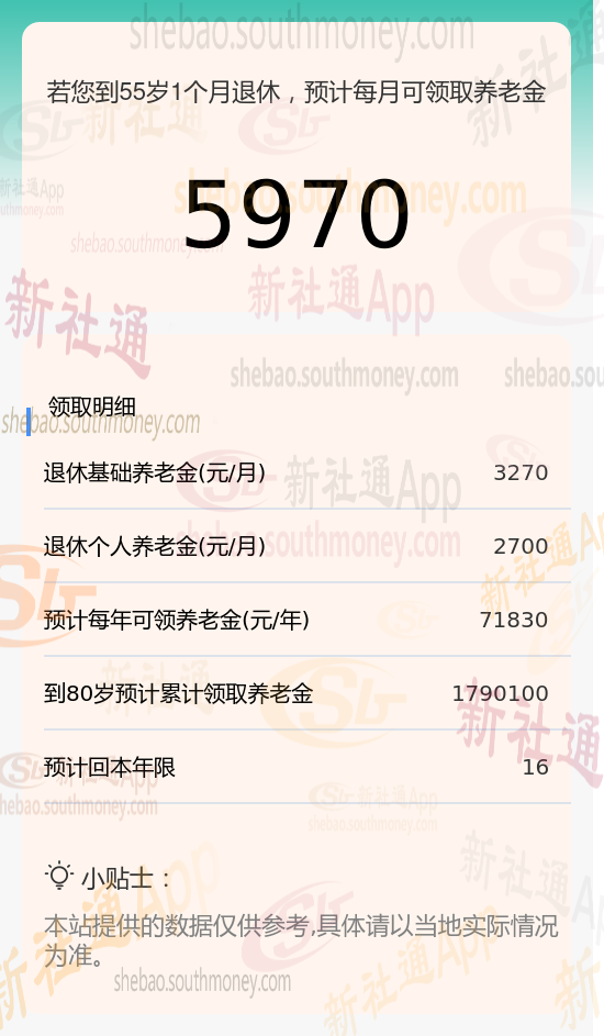 每月可领养老金总额:将基础养老金与个人养老金相加,每月可领取的养老金总额约为5970元(3270元+2700元)。