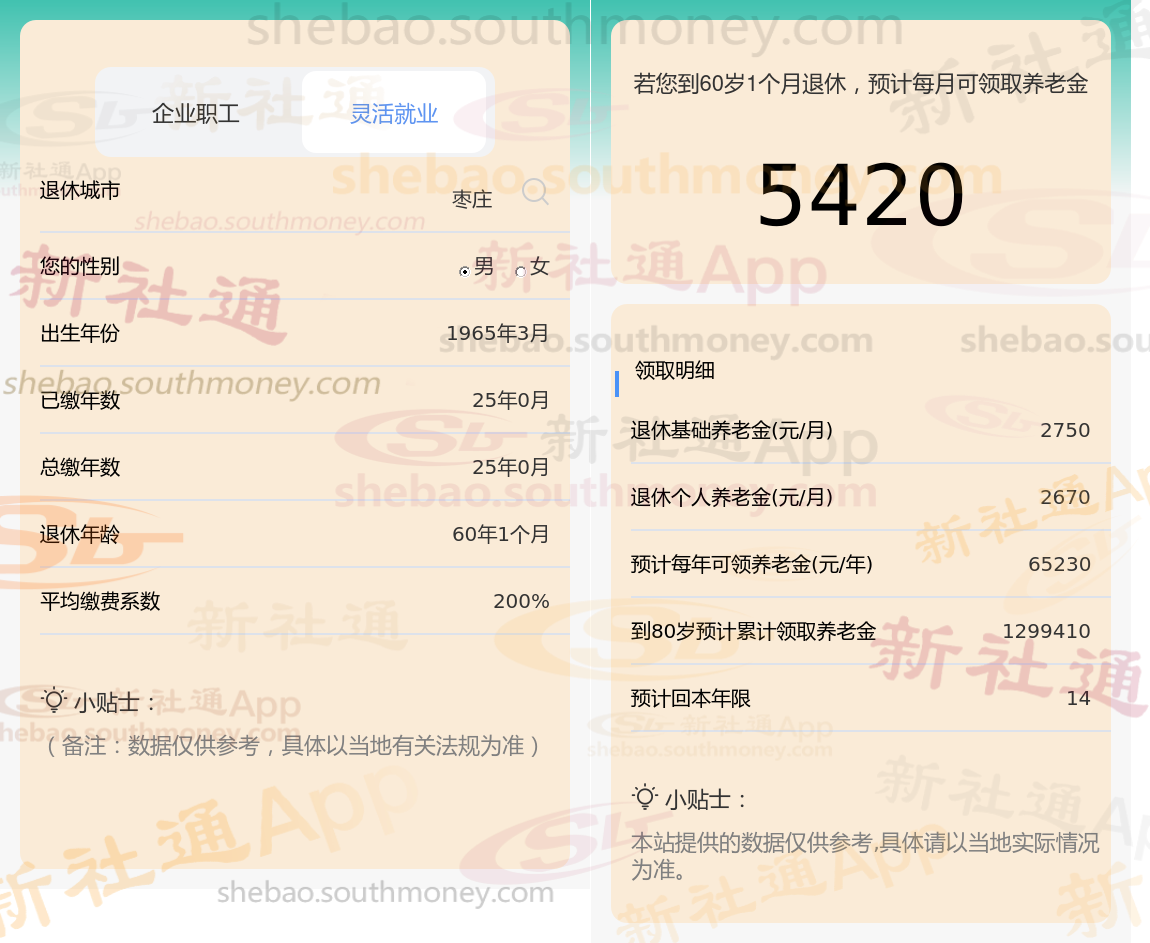 邻居吕某退休城市在山东枣庄,性别:男,出生年份:1965,总缴年数25年,缴费档次:200%,新社通app养老金计算器所得: