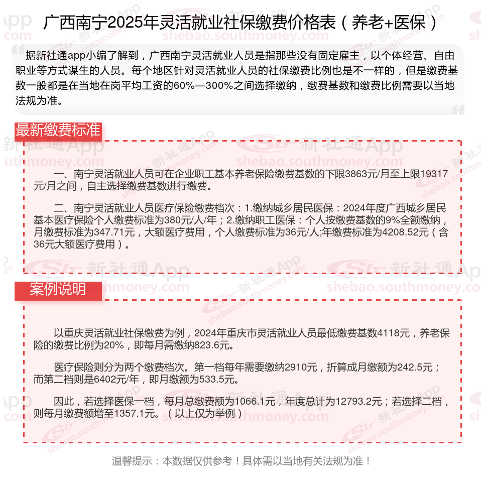 据新社通app数据显示,2024-2025年广西南宁灵活就业人员养老保险的缴费标准是根据缴费基数来确定的: