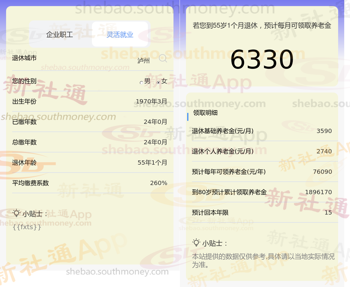 通过上面公式和新社APP根据新社通app-社保缴费查询工具提供的最新数据一起来了解下,四川泸州退休养老金怎么算?