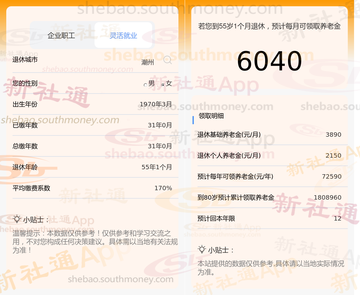 朋友夏某退休城市在潮州,性别:女,出生年份:1970,总缴年数31年,缴费档次:170%,新社通app养老金计算器所得: