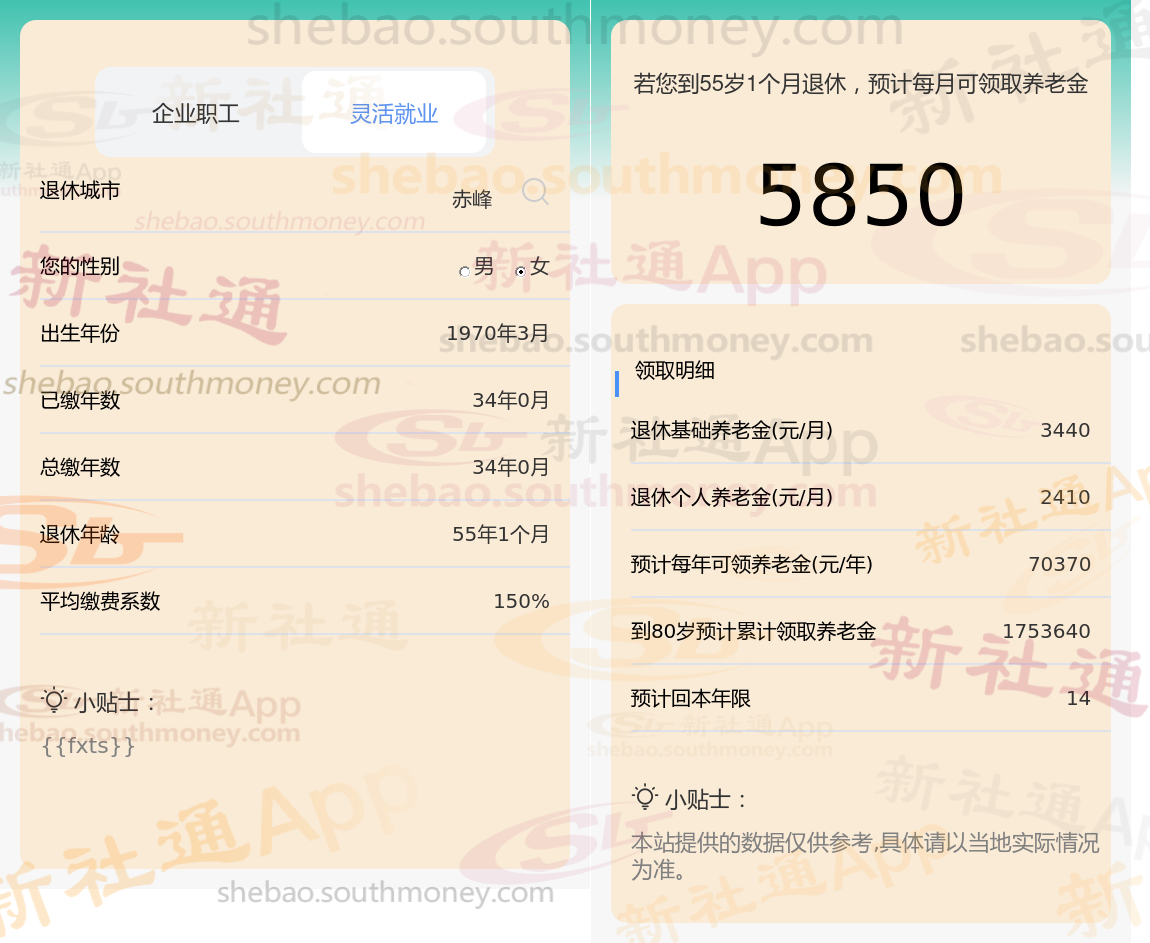新社通app养老金计算器计算所得: