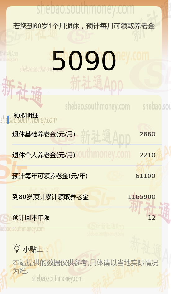 养老金总和:两者相加,每月养老金=2880元+2210元≈5090元/月。