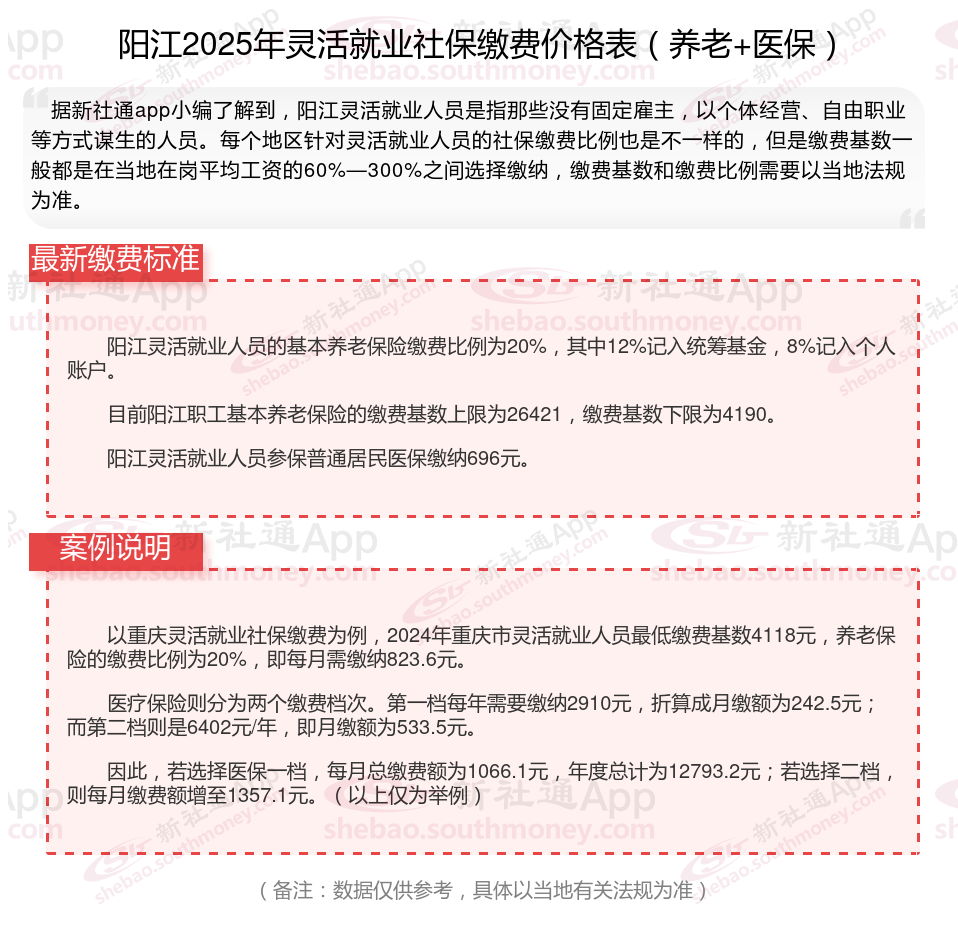 目前阳江职工基本养老保险的缴费基数上限为26421,缴费基数下限为4190。