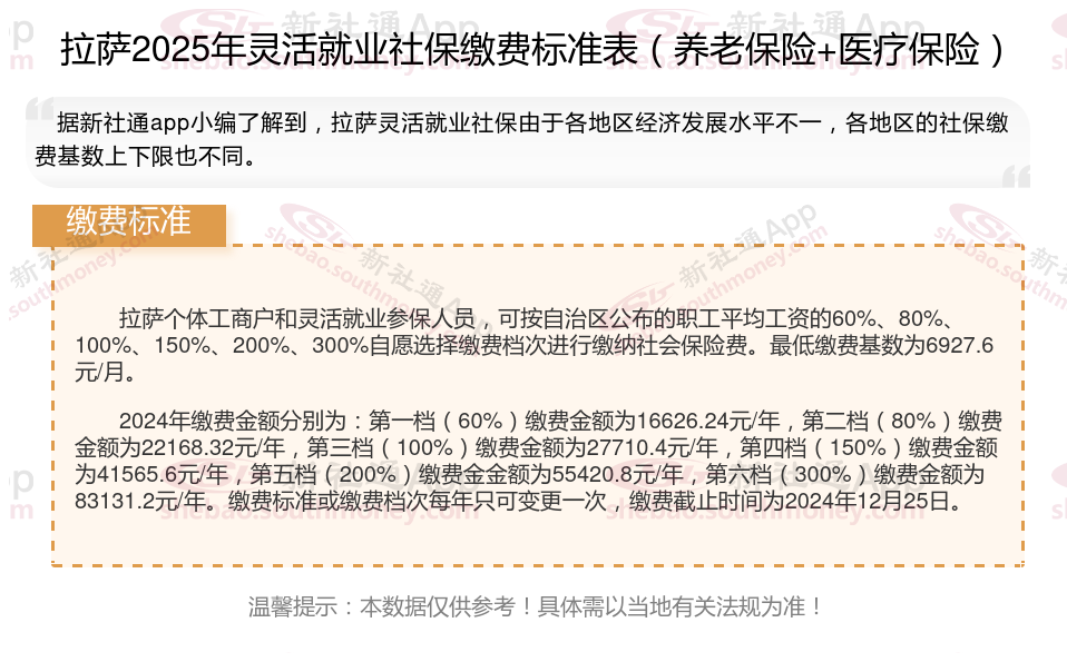 据新社通app数据显示,拉萨灵活就业养老保险的缴费基数为:6927.6元。灵活就业人员参保缴费的比例为个人20%。
