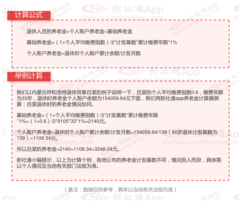 月基础养老金=(全省上年度所有职工的月平均工资本人指数化月平均缴费工资)÷2乘缴费年限乘1%。