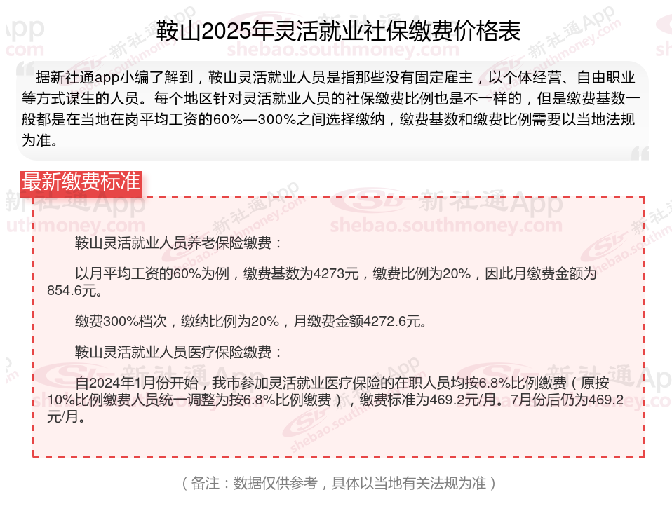 据新社通app数据显示,2024-2025年鞍山灵活就业人员养老保险的缴费标准: