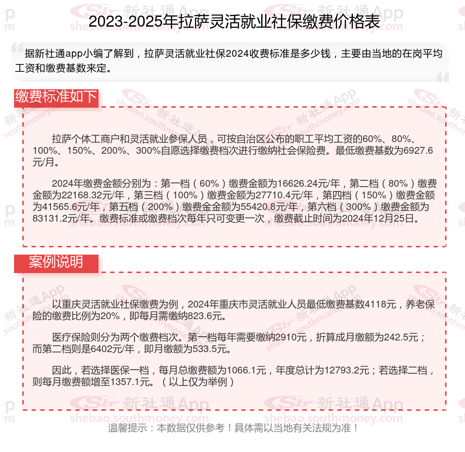 拉萨个体工商户和灵活就业参保人员,可按自治区公布的职工平均工资的60%、80%、100%、150%、200%、300%自愿选择缴费档次进行缴纳社会保险费。最低缴费基数为6927.6元/月。