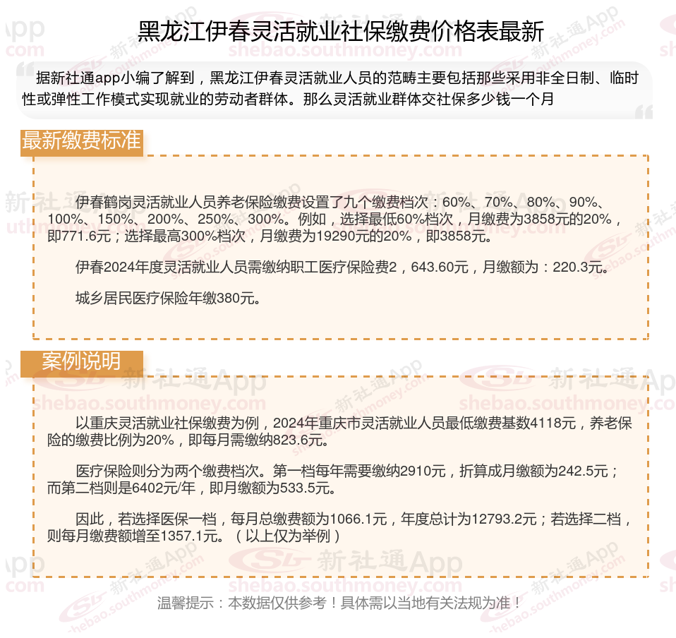 黑龙江伊春社保一个月自费多少钱?根据新社通app-社保缴费查询工具提供的最新数据如下: