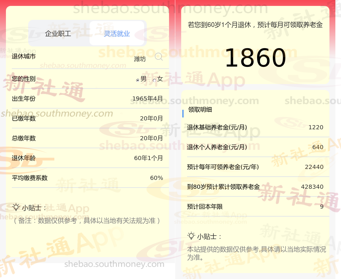 最近一位山东潍坊退休的男性灵活就业人员后台咨询,准备要退休了,工龄20年,每月按照60%档位缴纳,养老金如何计算呢?能领到1600元吗?