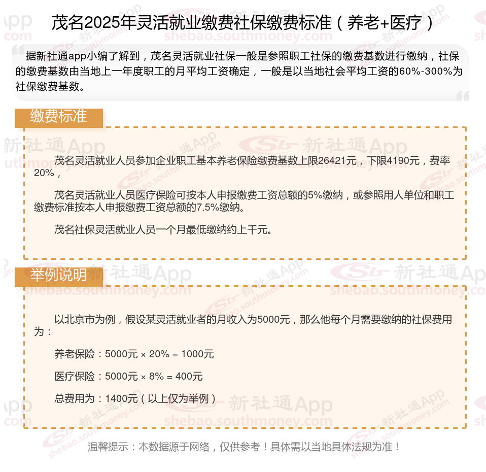 茂名社保灵活就业人员一个月最低缴纳约上千元。