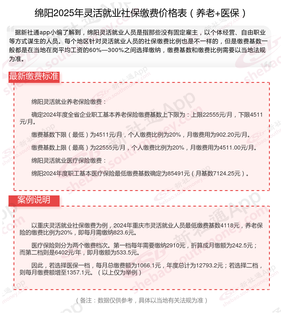据新社通app数据显示,绵阳灵活就业养老保险的缴费基数为:4511元。灵活就业人员参保缴费的比例为个人20%。