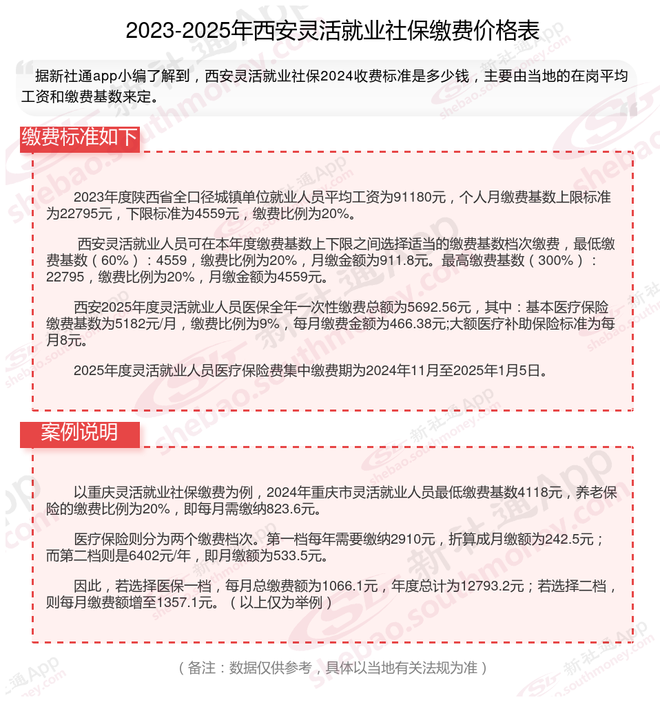 据新社通app数据显示,西安企业灵活就业养老保险的缴费基数为:4559元。