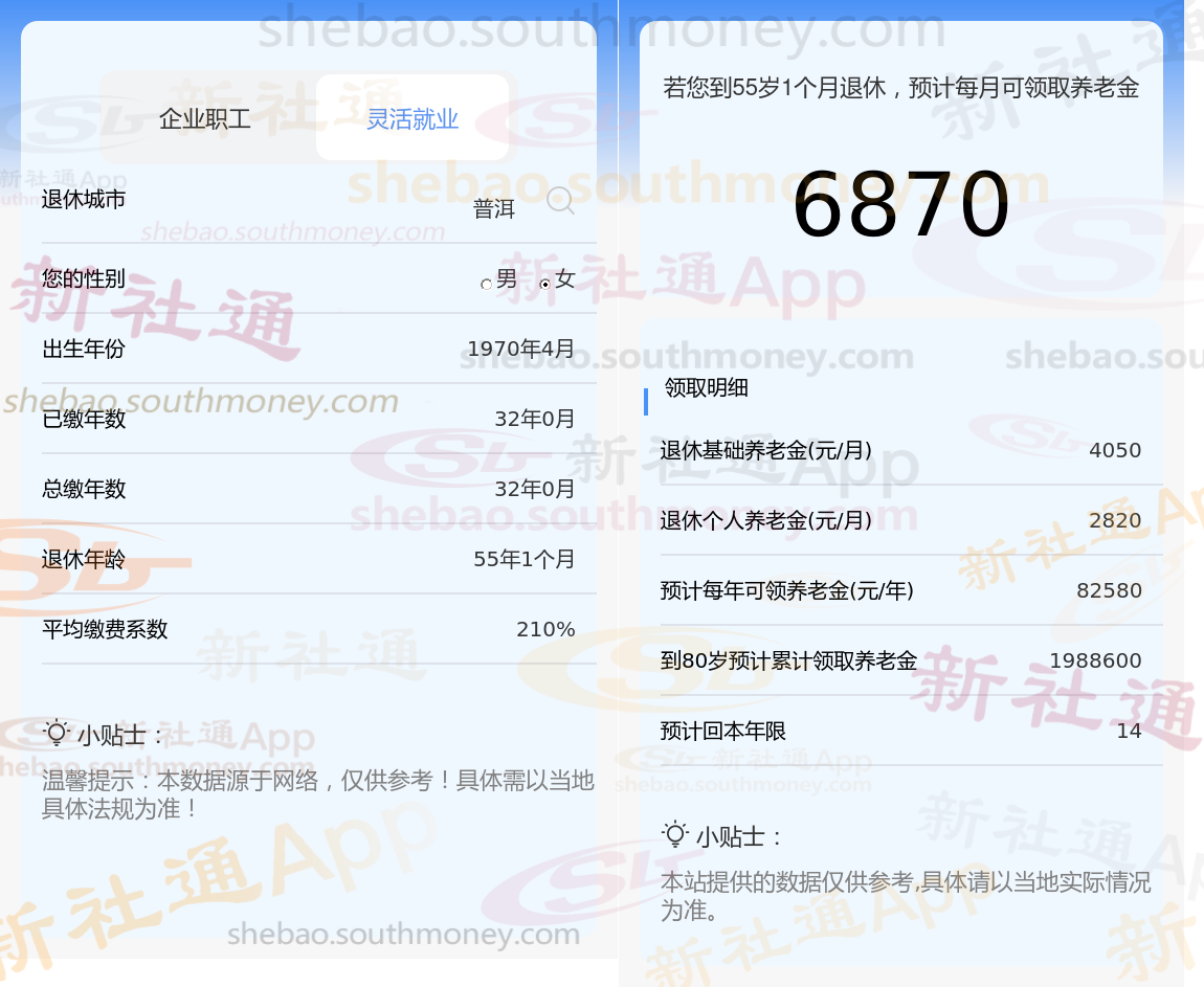 康某一位1970年出生的女性,目前定居在风景秀丽的普洱并享受着退休生活。她的社会保险缴纳年限是32年,且一直以较高的210%档次进行缴费,展现了她对未来生活的充分规划与准备。