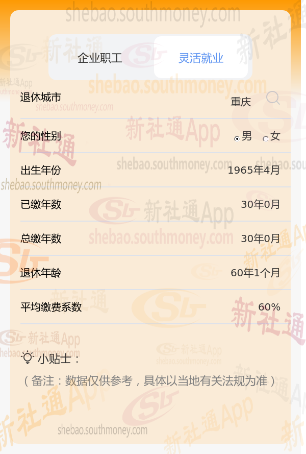 退休城市:重庆,性别:男,出生年份:1965,总缴年数30年,缴费档次:60%