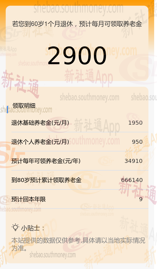 每月可领养老金总额:将基础养老金与个人养老金相加,每月可领取的养老金总额约为2900元(1950元+950元)。