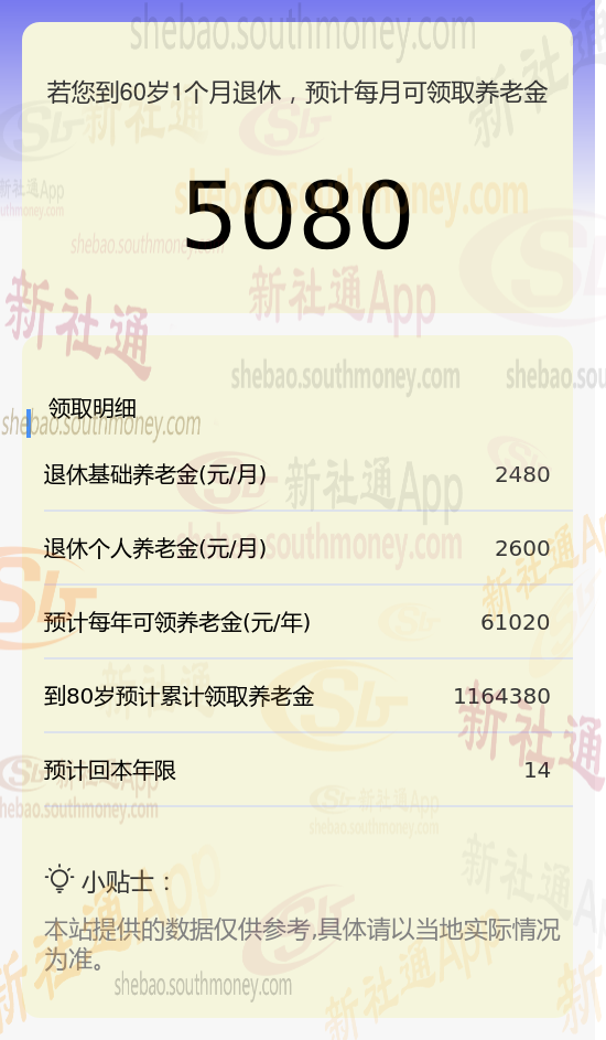 总养老金金额:两者合计,您每月可领取的养老金待遇总额为5080元/月。