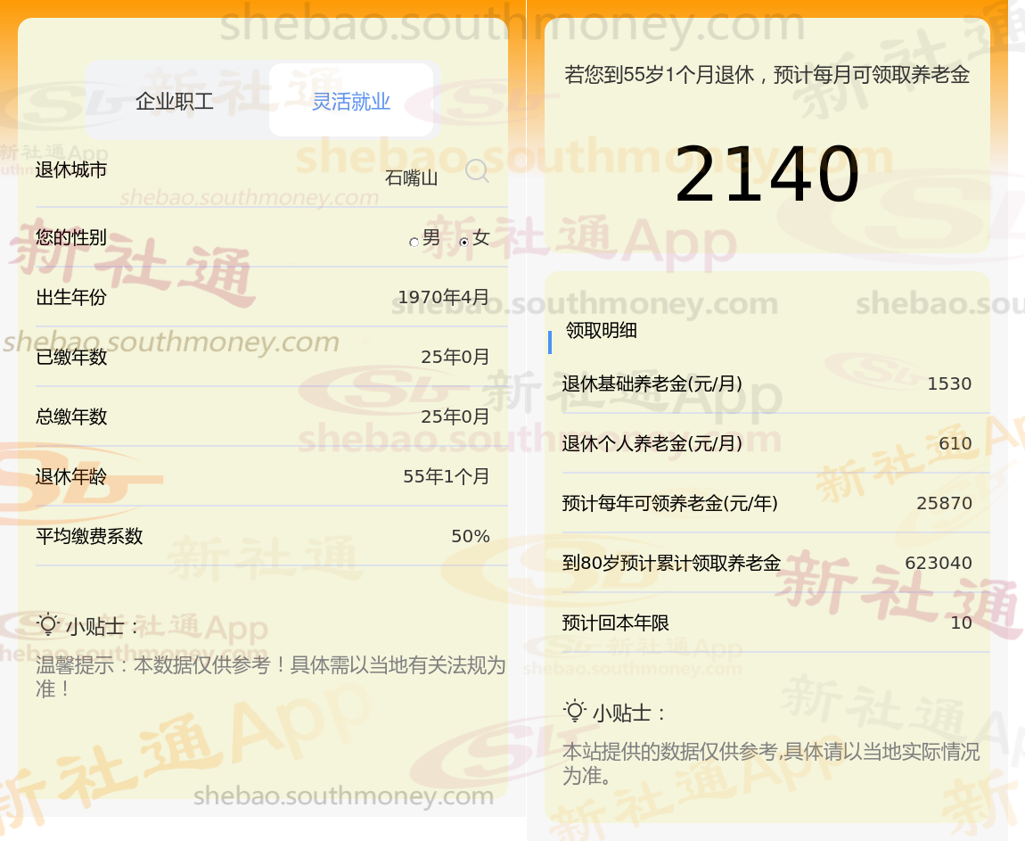 退休城市:石嘴山,性别:女,出生年份:1970,总缴年数25年,缴费档次:50%,新社通app养老金计算器所得: