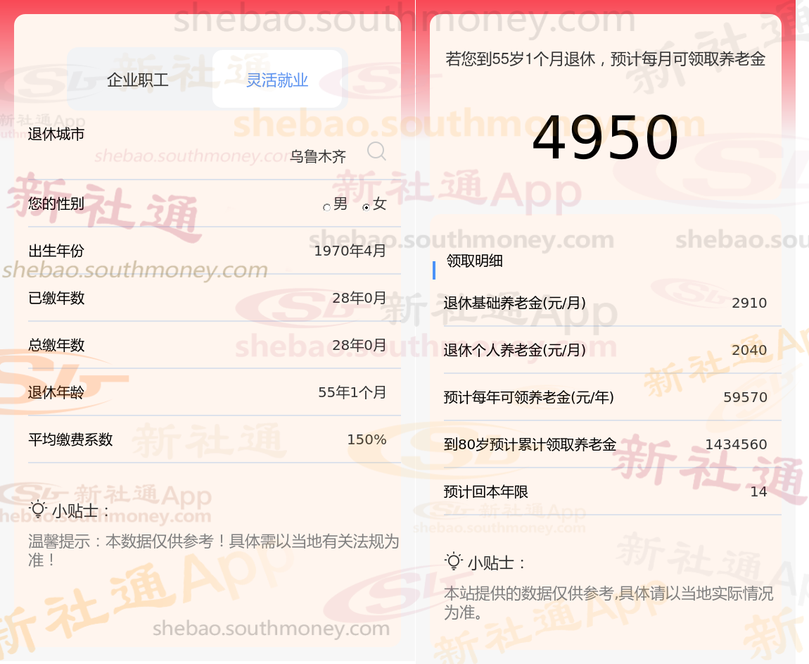 退休城市:乌鲁木齐,性别:女,出生年份:1970,总缴年数28年,缴费档次:150%,新社通app养老金计算器所得: