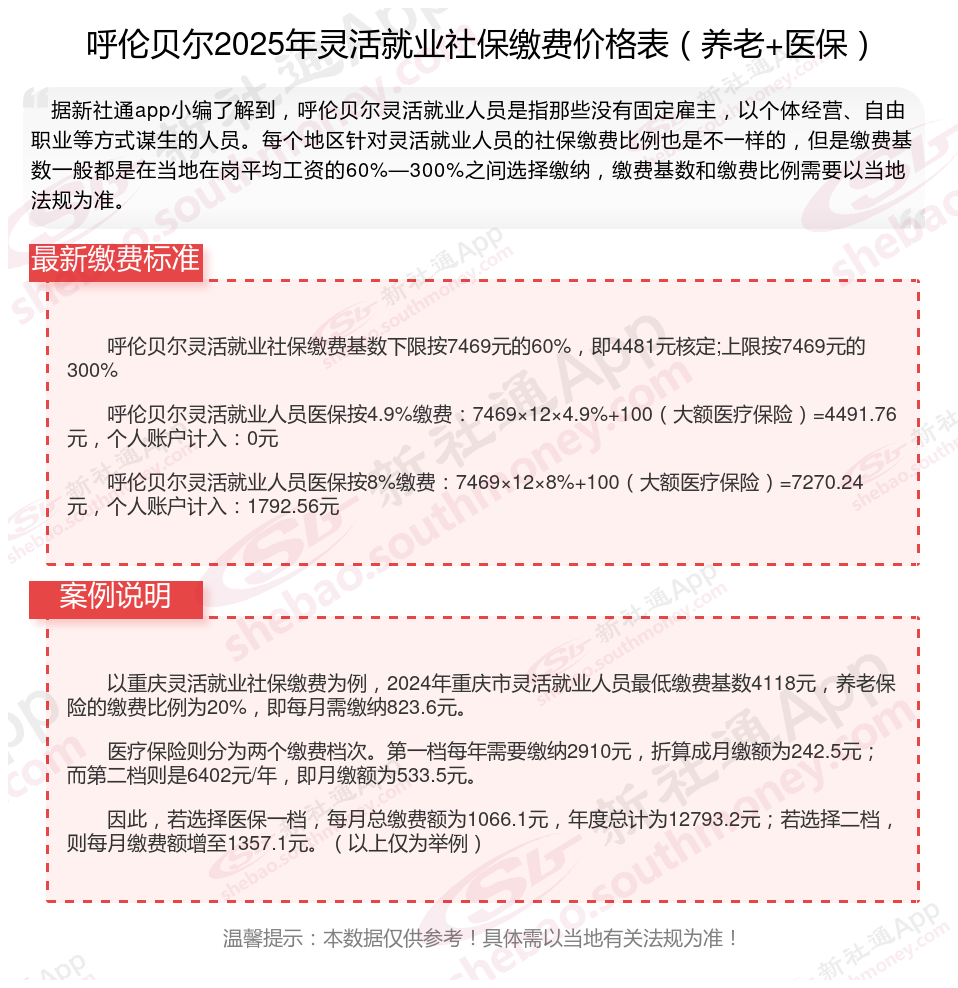 据新社通app数据显示,呼伦贝尔灵活就业养老保险缴费基数2024-2025年最新标准如下: