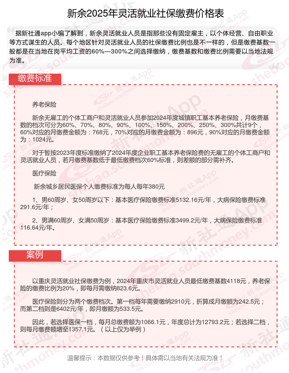 据新社通app数据显示,新余灵活就业人员养老缴费基数2024-2025年最新标准如下: