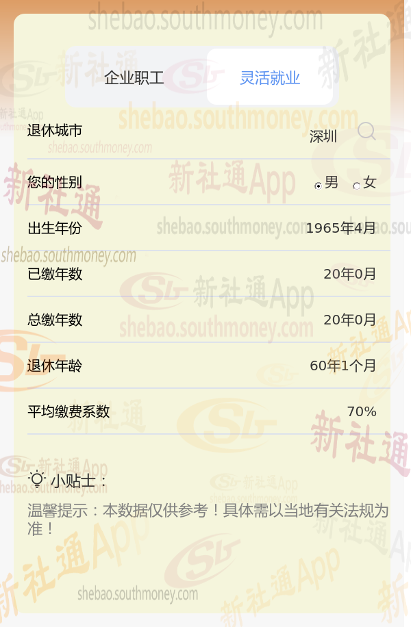 笔友孔某退休城市在深圳,性别:男,出生年份:1965,总缴年数20年,缴费档次:70%