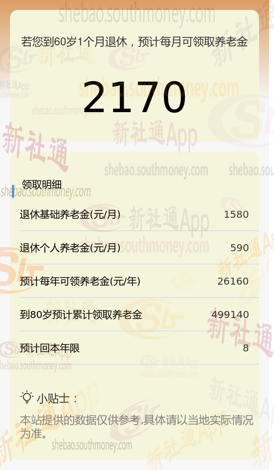 每月可领养老金总额:将基础养老金与个人养老金相加,每月可领取的养老金总额约为2170元(1580元+590元)。