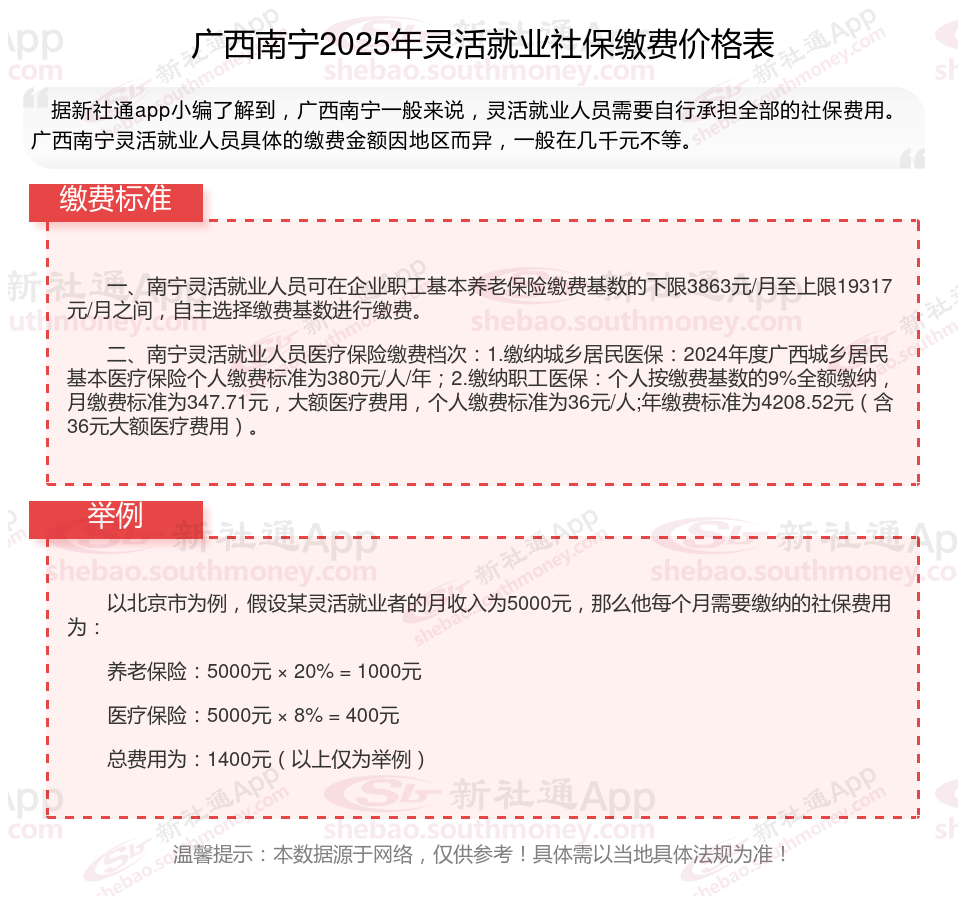 据新社通app数据显示,广西南宁灵活就业养老保险缴费基数2024-2025年最新标准如下: