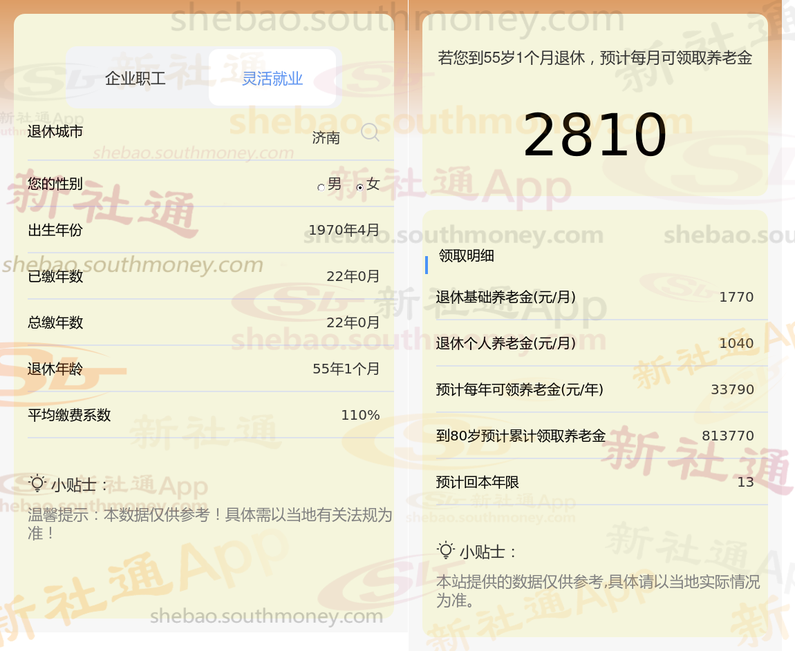 网友沈某退休城市在山东济南,性别:女,出生年份:1970,总缴年数22年,缴费档次:110%,新社通app养老金计算器所得: