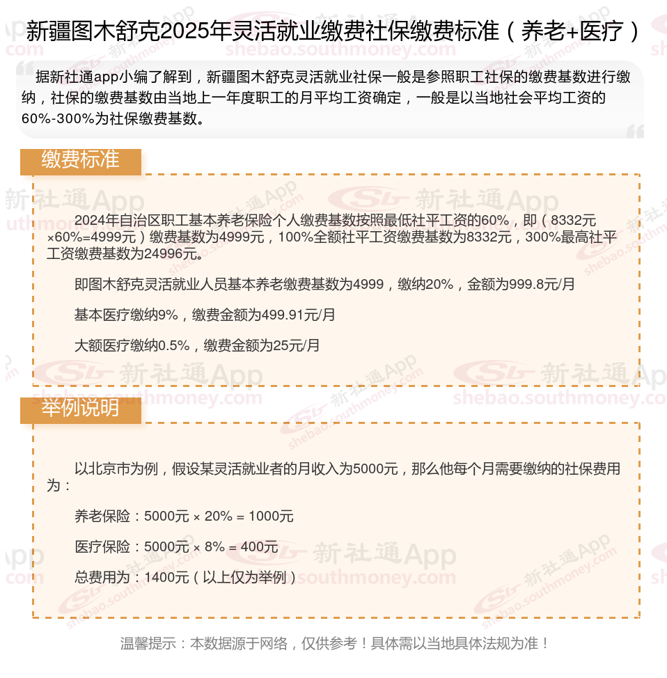 2025年新疆图木舒克城镇职工社会保险缴费基数用人单位及其职工(包括有雇工的个体工商户及其雇工)分别按2024年度全口径省平的60%(4999元/月)和300%(24996元/月)核定缴费基数的下限和上限执行。