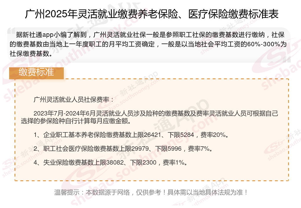 据新社通app数据显示,广州灵活就业养老保险的缴费基数为:5284元。灵活就业人员参保缴费的比例为个人20%。