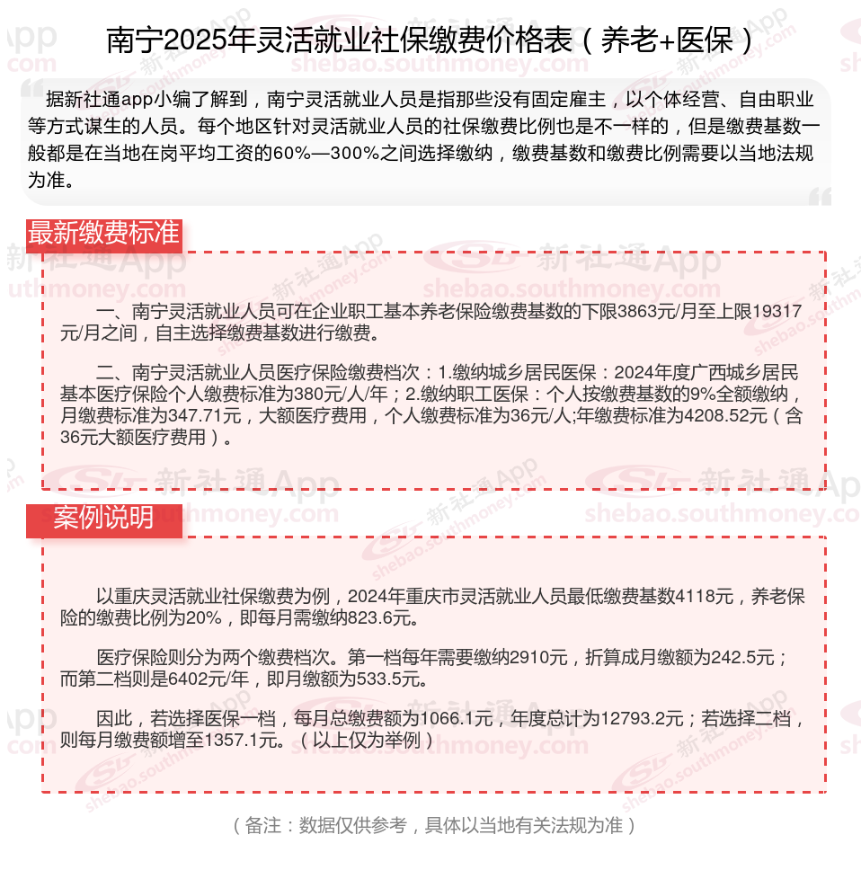 据新社通app数据显示,2024-2025年南宁灵活就业人员养老保险的缴费标准: