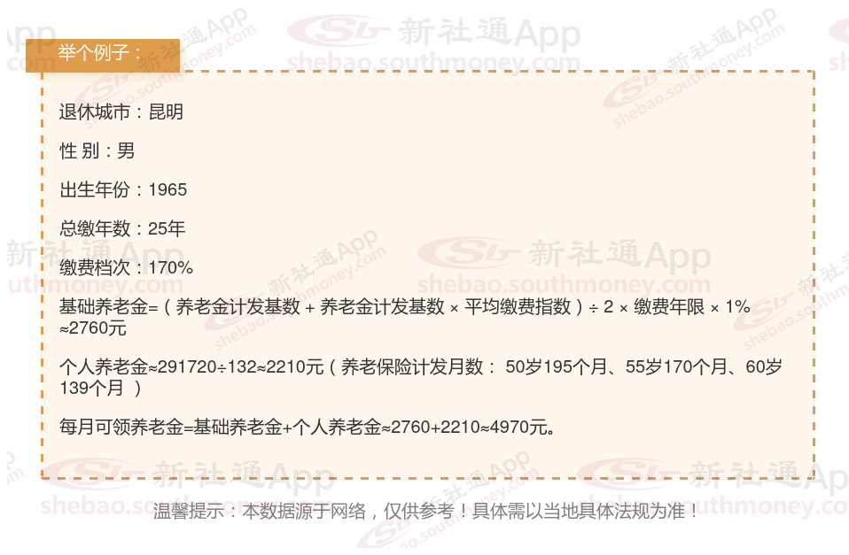 退休城市:昆明,性别:男,出生年份:1965,总缴年数25年,缴费档次:170%