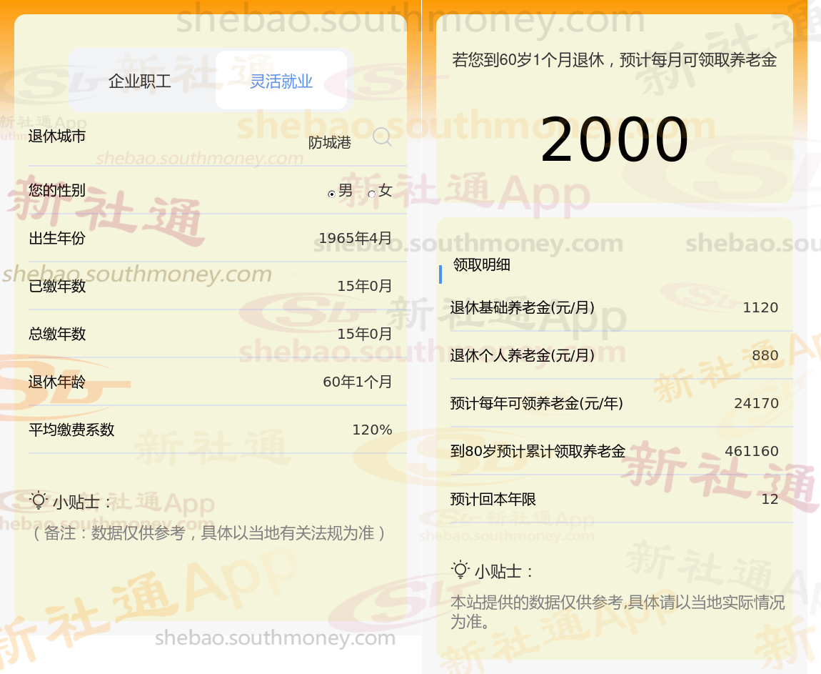 退休城市:防城港,性别:男,出生年份:1965,总缴年数15年,缴费档次:120%,新社通app养老金计算器所得: