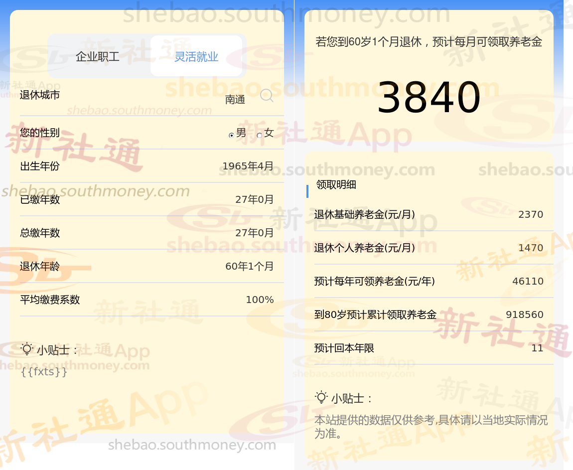 亲戚朱某退休城市在南通,性别:男,出生年份:1965,总缴年数27年,缴费档次:100%,新社通app养老金计算器所得: