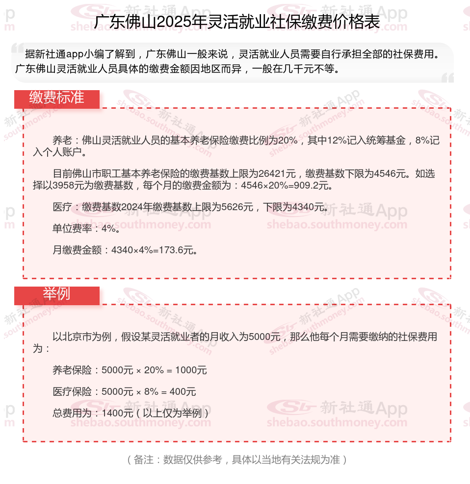 据新社通app数据显示,广东佛山灵活就业养老保险最低缴费基数为:4546元;个人的缴费比例分别为:20%;