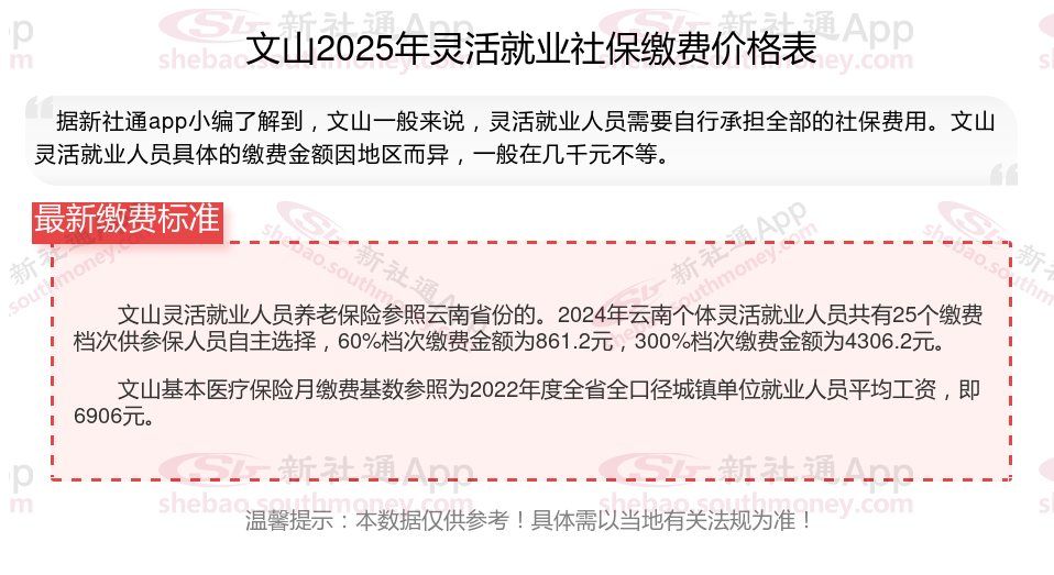 据新社通app数据显示,文山企业灵活就业养老保险的缴费基数为:4306.2元。