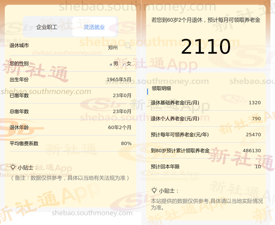 退休城市:郑州,性别:男,出生年份:1965,总缴年数23年,缴费档次:80%,新社通app养老金计算器所得: