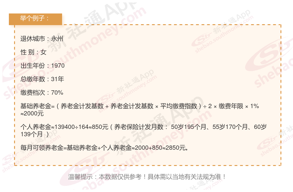 退休城市:永州,性别:女,出生年份:1970,总缴年数31年,缴费档次:70%