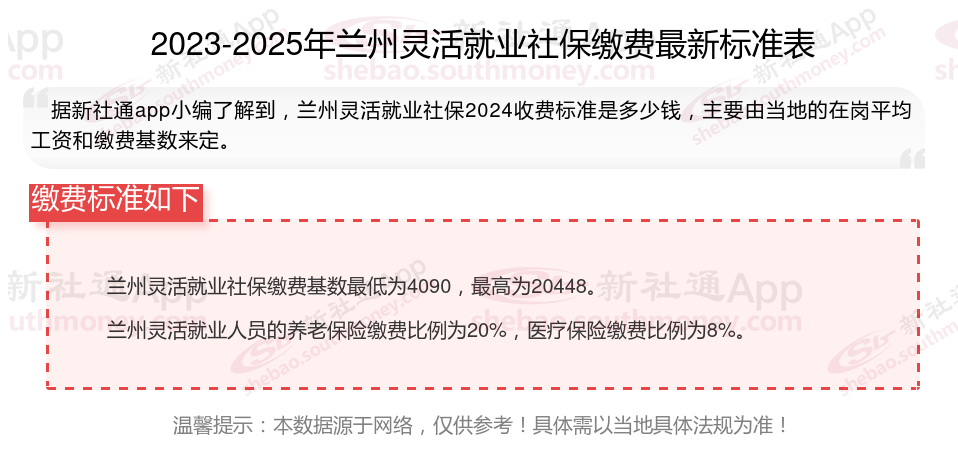 据新社通app数据显示,兰州灵活就业养老保险缴费基数2024-2025年最新标准如下: